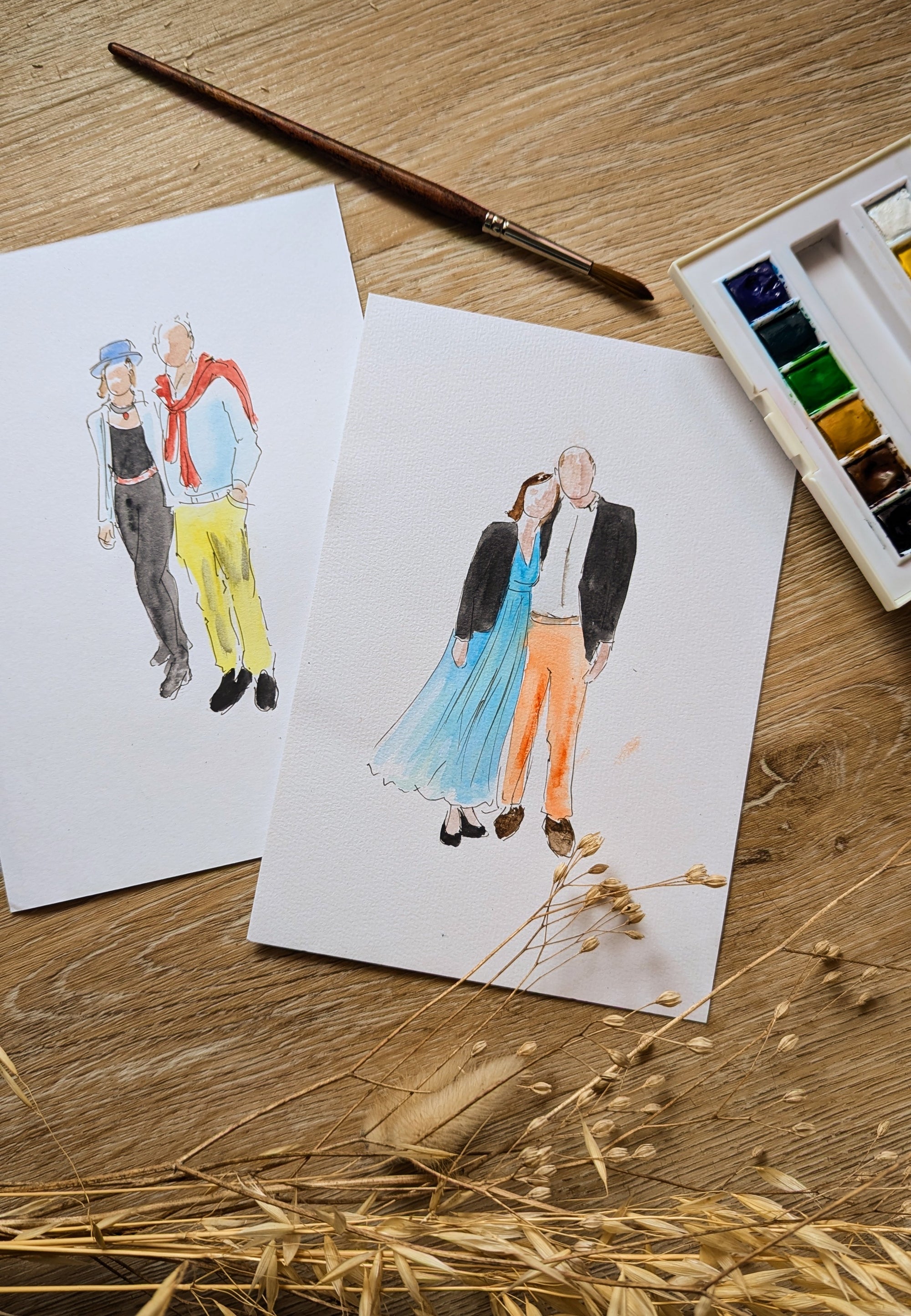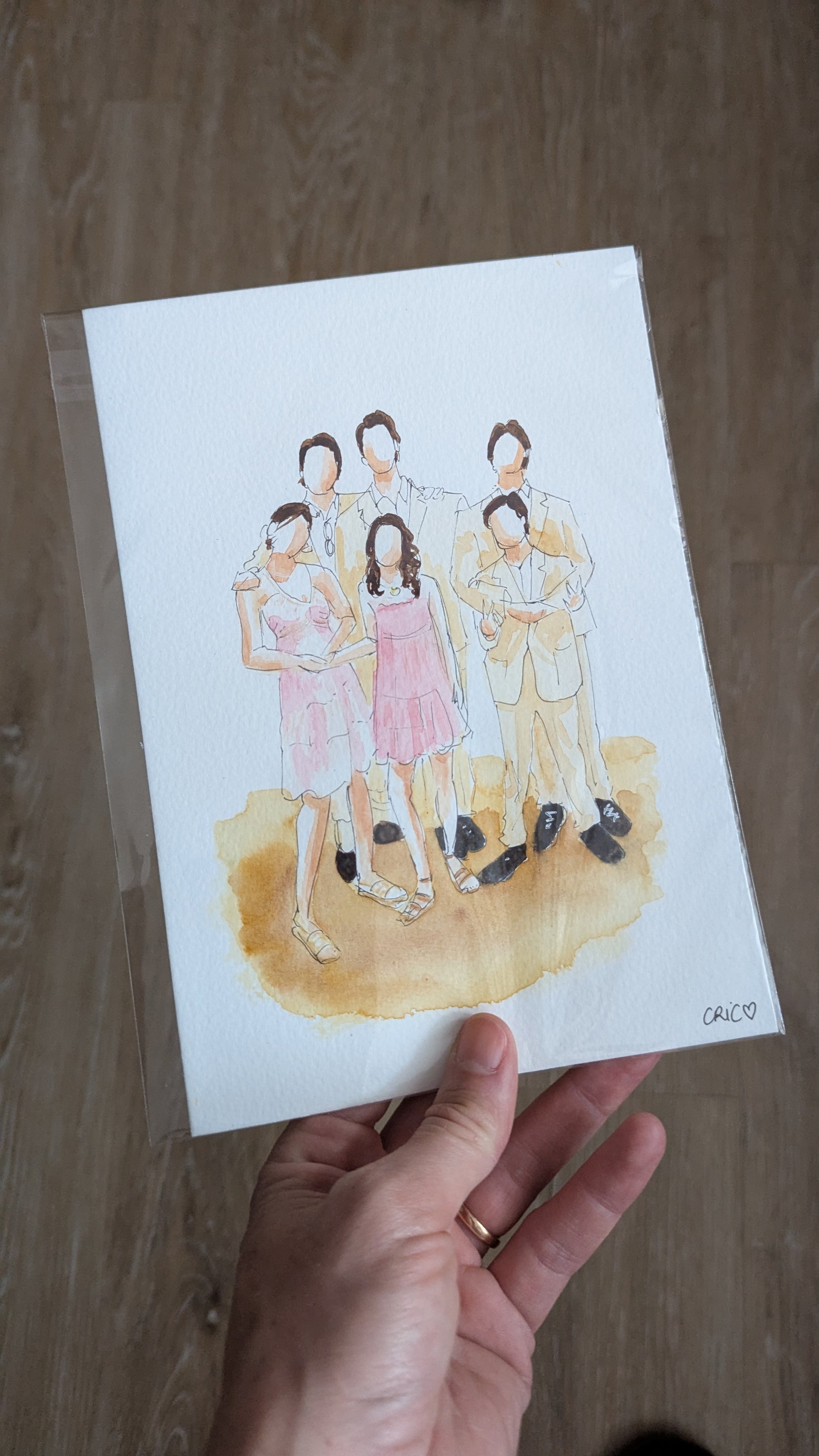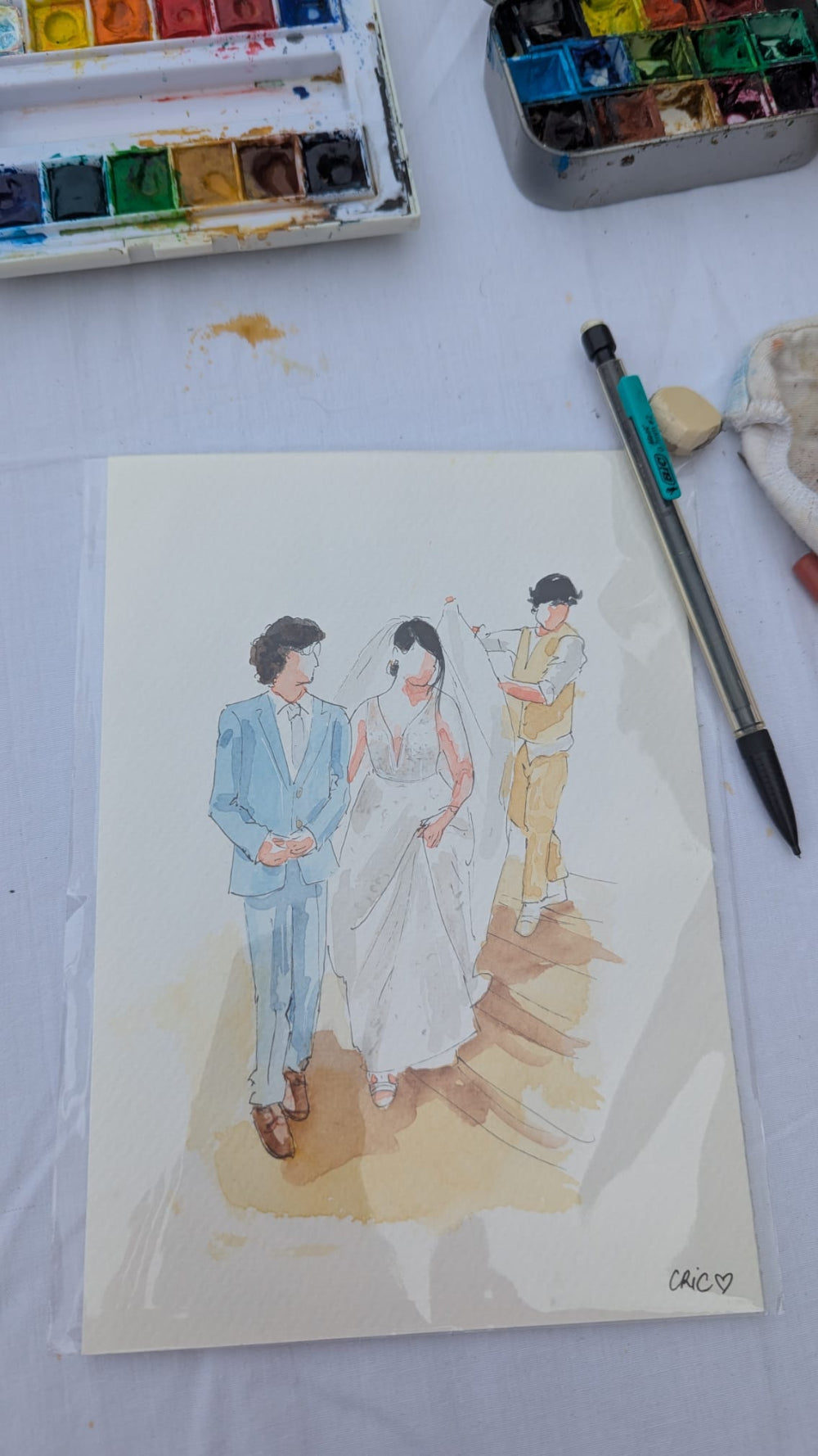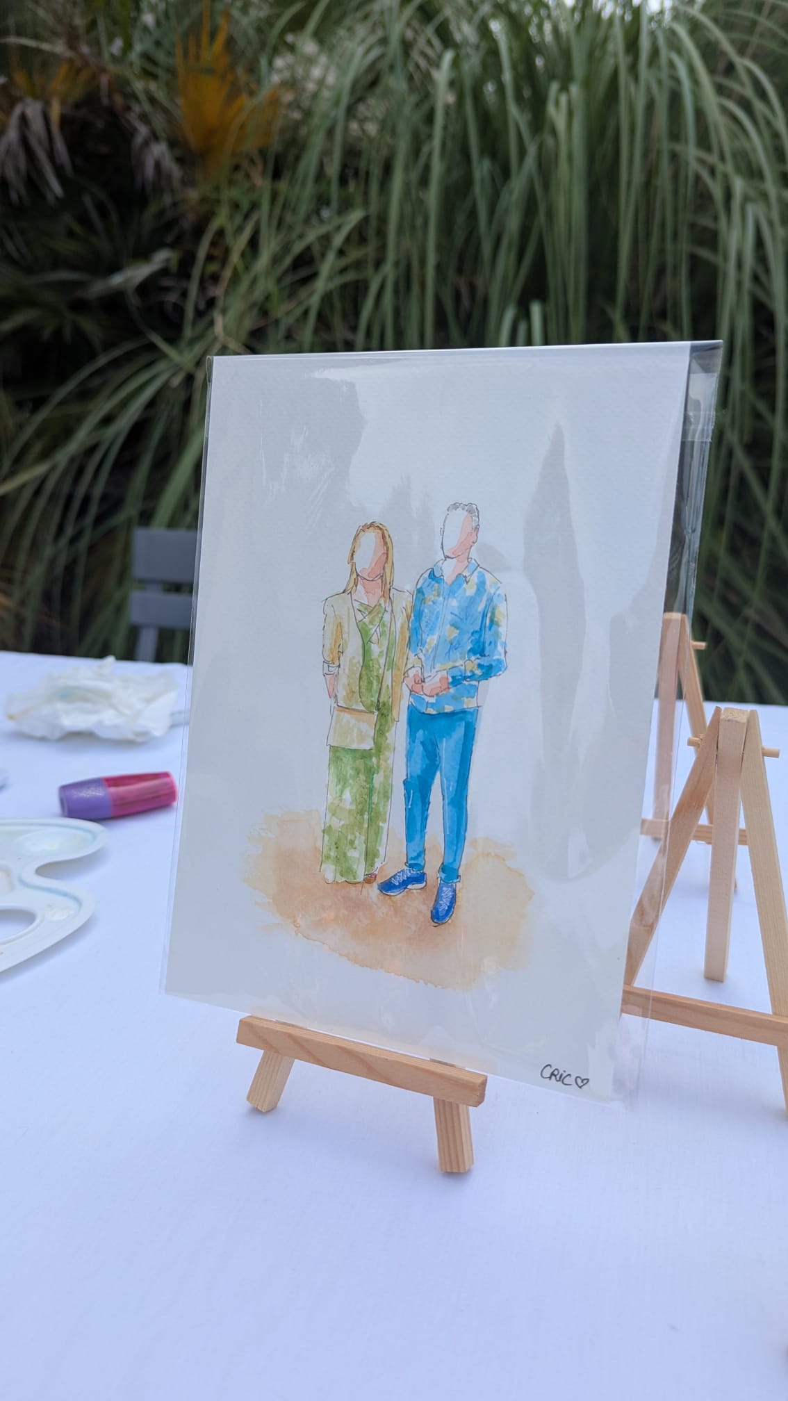 Le jour J : J’arrive avant le début de la prestation pour installer ma table et mon matériel — j’apporte tout, sauf le parasol. Je prends en photo vos invités et commence à les peindre. Les portraits sont remis au fur et à mesure ou à la fin de la soirée. Lorsqu’il n’y a plus assez de lumière, je déplace mon matériel pour peindre à l’abri de l’humidité et sous lampe. Les portraits non terminés sur place sont finalisés à l’atelier, puis envoyés par la poste.
