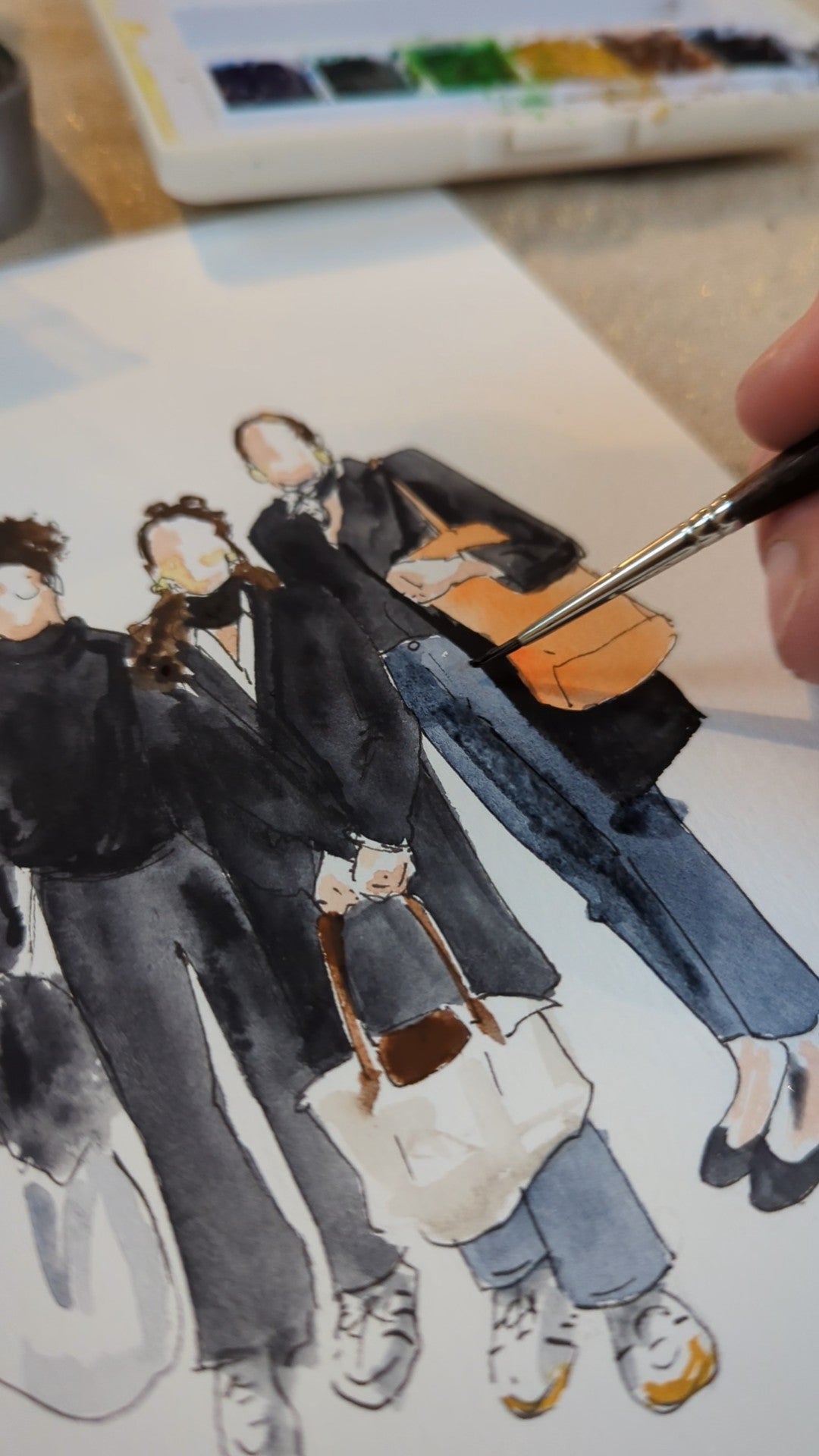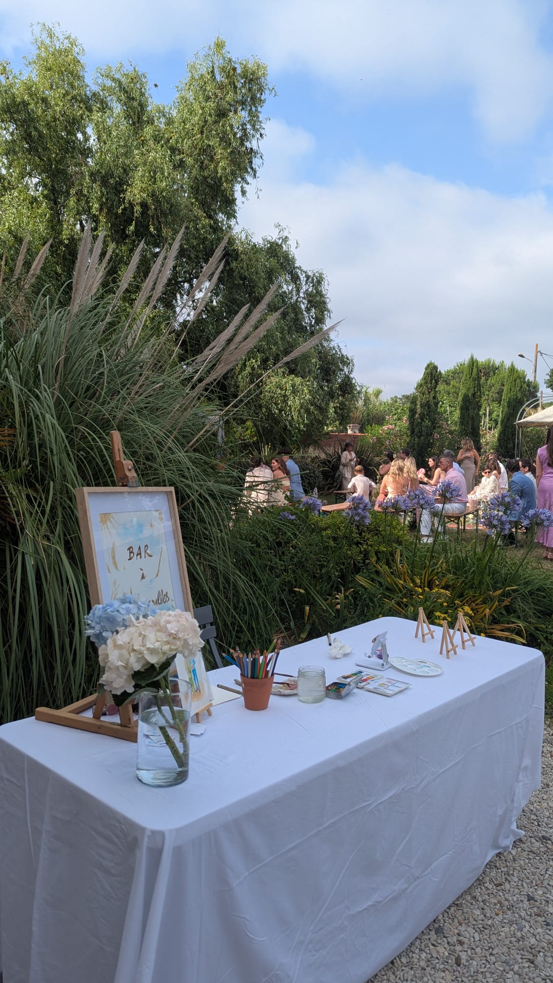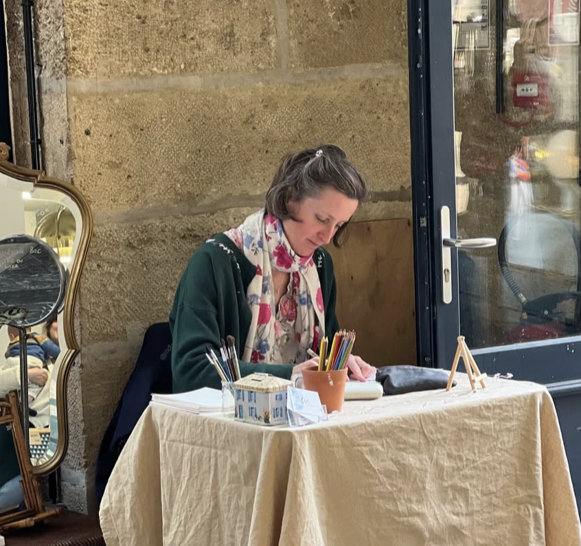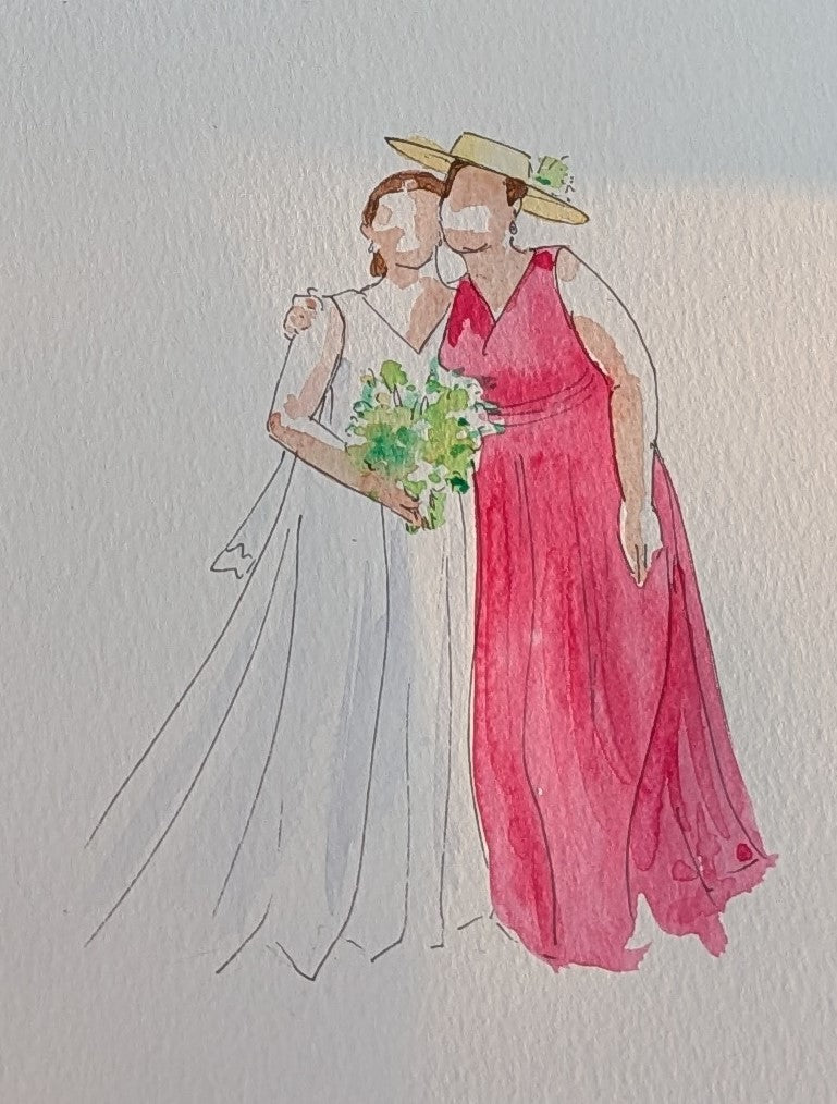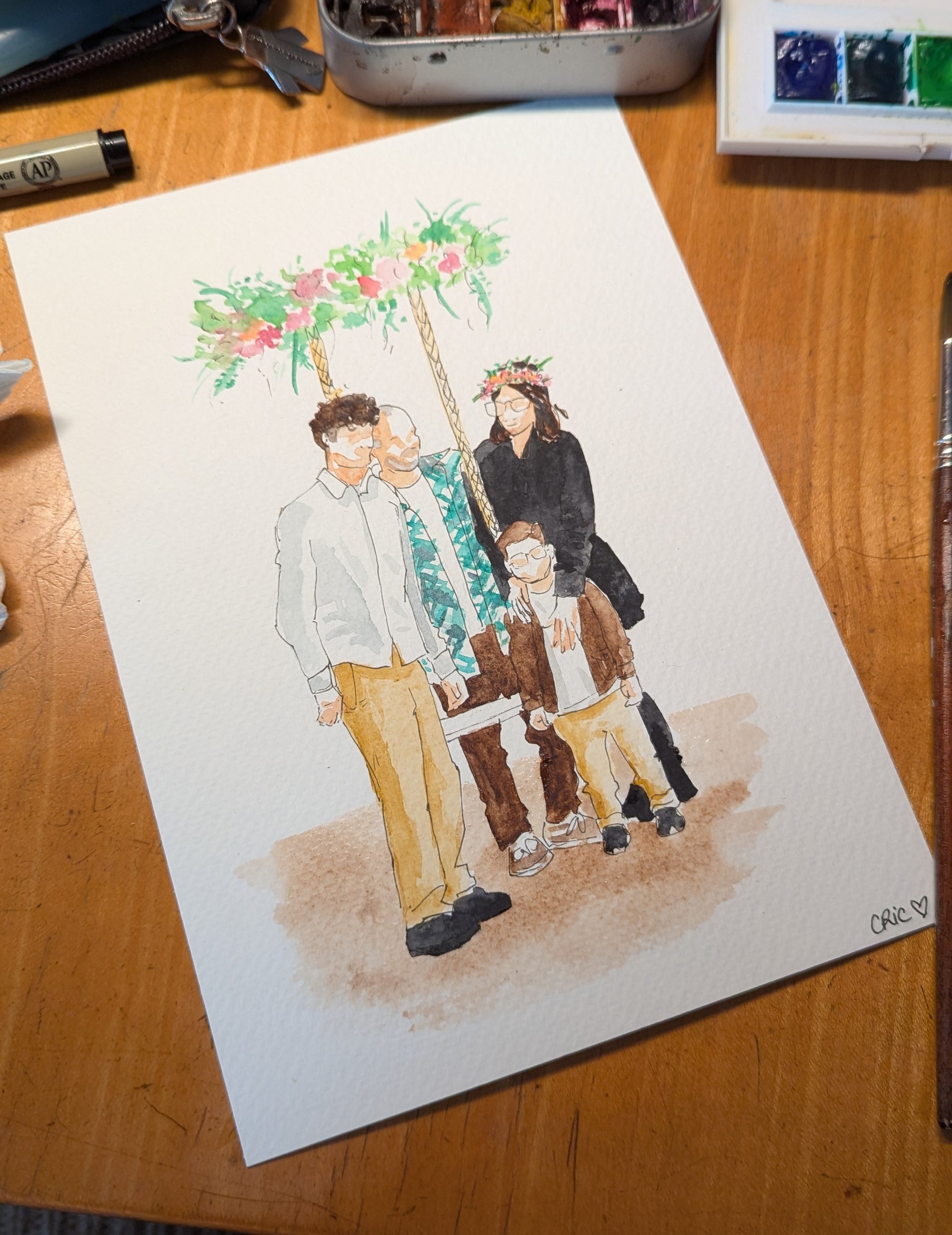 Le jour J : J’arrive avant le début de la prestation pour installer ma table et mon matériel — j’apporte tout, sauf le parasol. Je prends en photo vos invités et commence à les peindre. Les portraits sont remis au fur et à mesure ou à la fin de la soirée. Lorsqu’il n’y a plus assez de lumière, je déplace mon matériel pour peindre à l’abri de l’humidité et sous lampe. Les portraits non terminés sur place sont finalisés à l’atelier, puis envoyés par la poste.